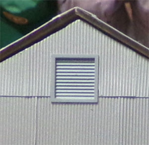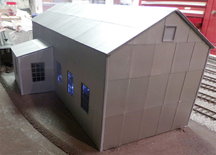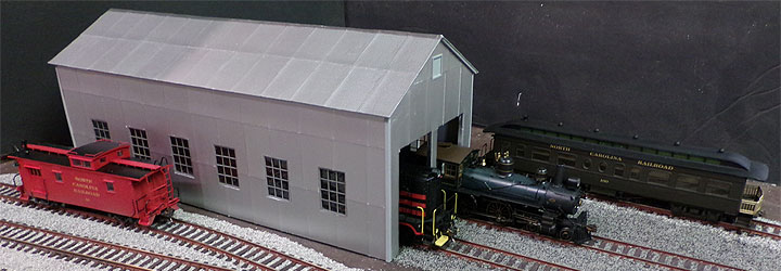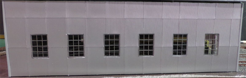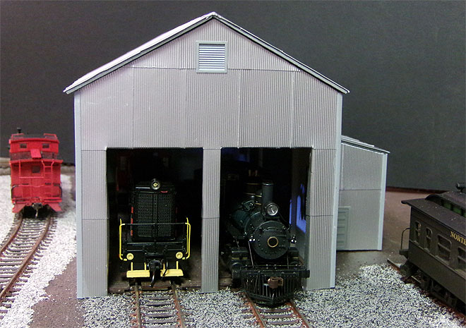 This HO scale model would be for 2 locomotives. The model will have the 2 optional rear walls. One with windows and the drive thru opening. As to the prototype mental siding it was a dull finish. Most scale metal siding availible has a shiny finish, we have found some that does not have a shiny finish. We also added a peel and stick to the back surface. 2" track center.East Coast Laser Kit: 2-Stall Metal Engine House (HO Scale)