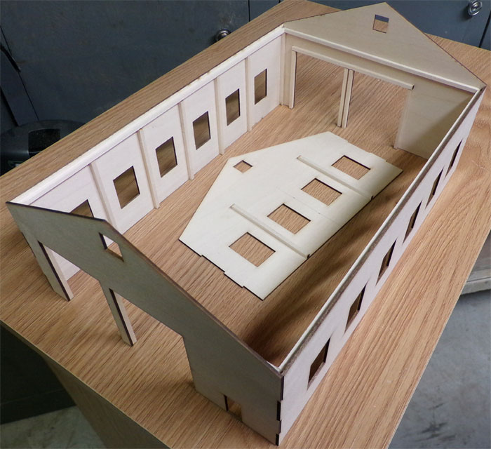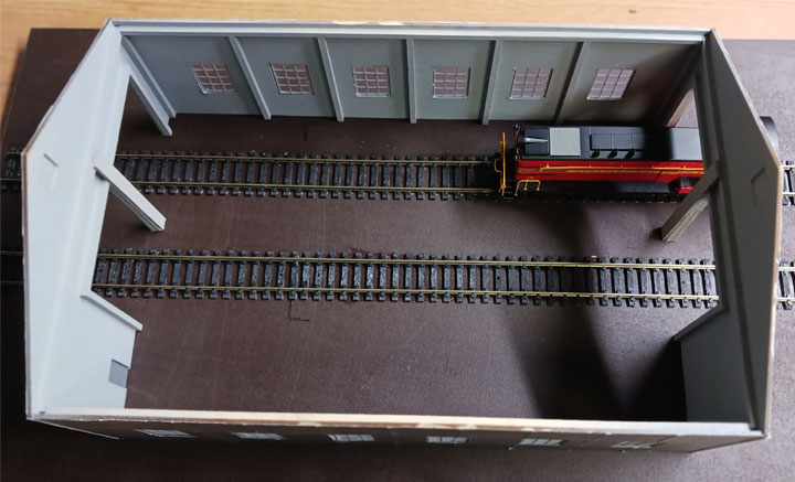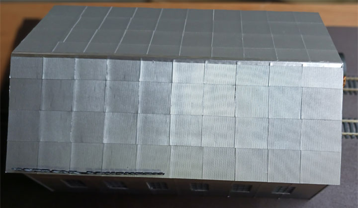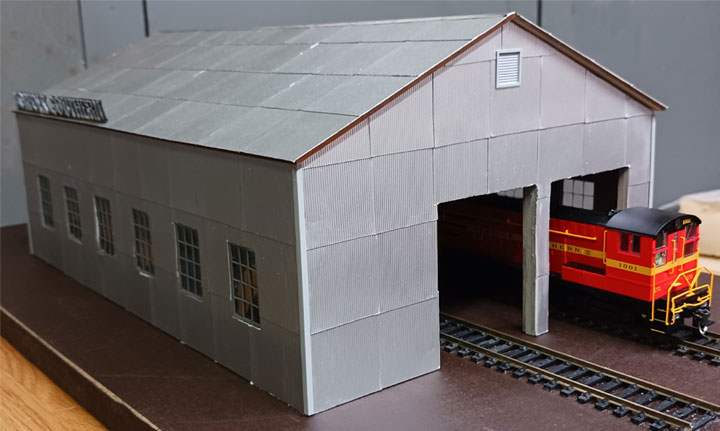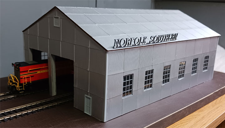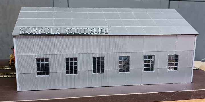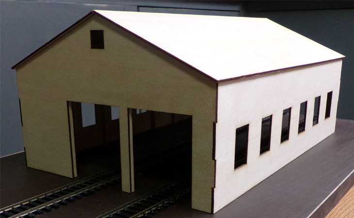 This shorter version of the NS Glenwood engine house is (12.5" X 8"). The Glenwood Yard engine house was longer for 4 locomotives. This HO scale model would be for 2 locomotives. This model has the 2 optional rear walls, a 4 window wall and a 2 door openings for the drive thru opening. As to the prototype mental siding it was a dull finish. Most scale metal siding available has a shiny finish, we have found some that does not have a shiny finish. We also added a peel and stick to the back surface.2½" track center. We also have just the Wood Framing Laser Kit includes Windows & Door, 2 End Vents (without Metal Roof/Siding) $85